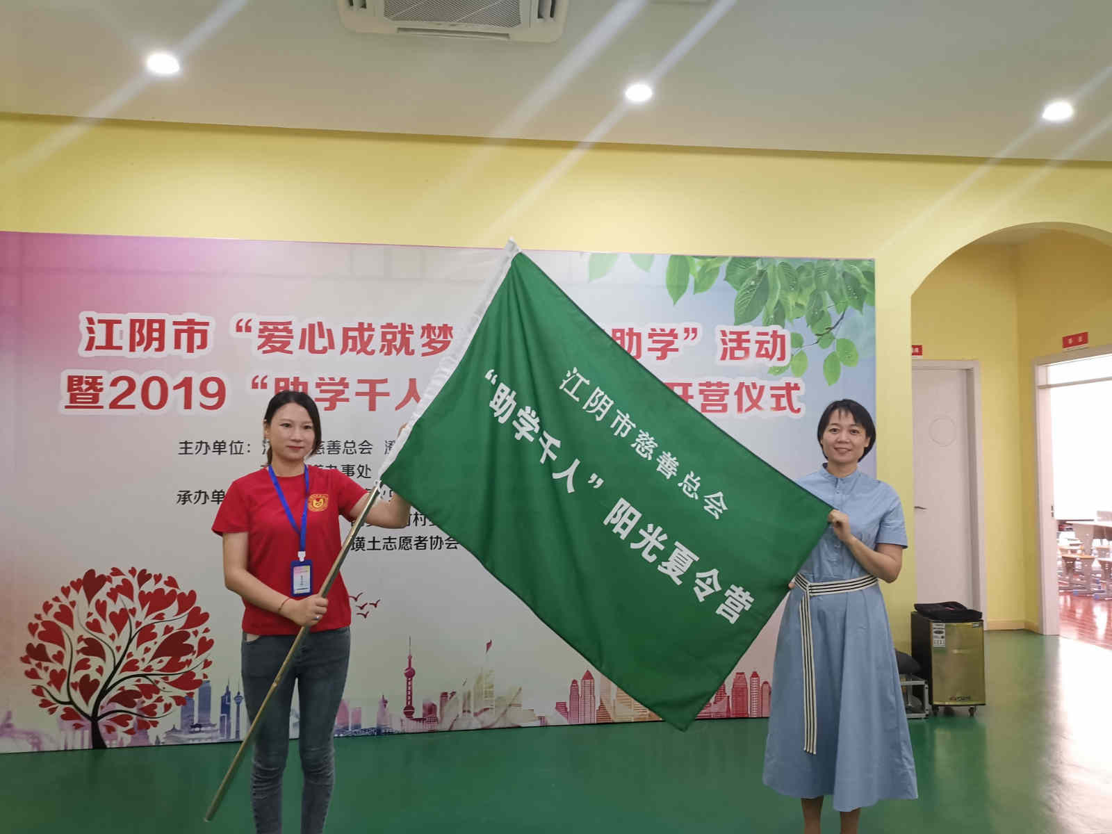 江阴市民政局副局长许海英为“助学千人”阳光夏令营授旗并宣布开营。