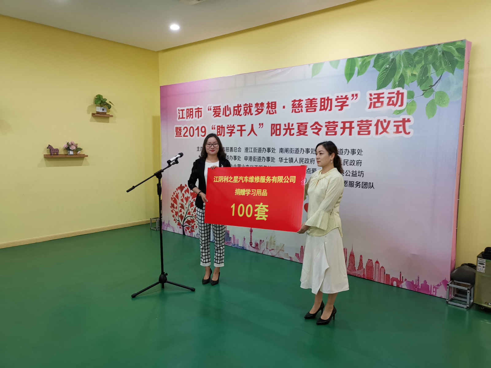 市慈善总会副主任龚海燕女士接收江阴利之星汽车维修服务公司领导朱玉芳女士代表公司为助学的捐赠。