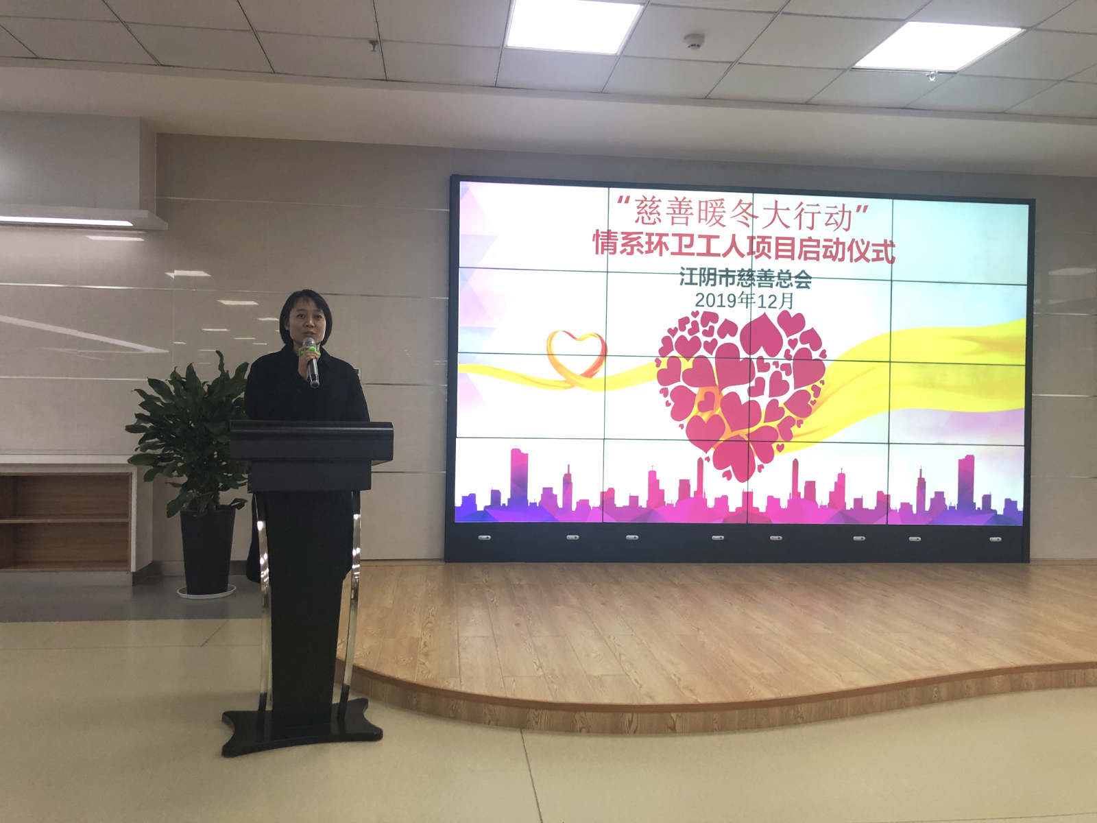 2019年12月17日下午,江阴市慈善总会“慈善暖冬大行动”暨情系环卫工人项目启动仪式在市社会救助中心隆重举行,江阴市民政局副局长许海英,江阴市公用事业管理局党委副书记吴群力,江阴市捐赠救助中心副主任龚海燕,江阴市环卫处副主任武传刚出席本次活动。