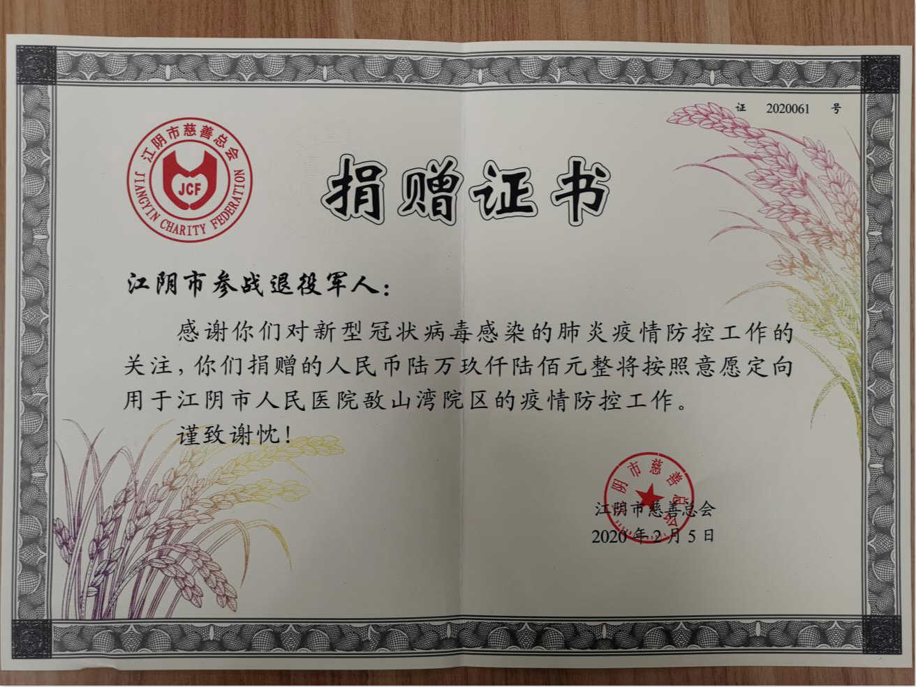 这些参战退役军人将善款定向捐赠给江阴人民医院敔山湾院区,为医院的疫情防控工作增砖添瓦。