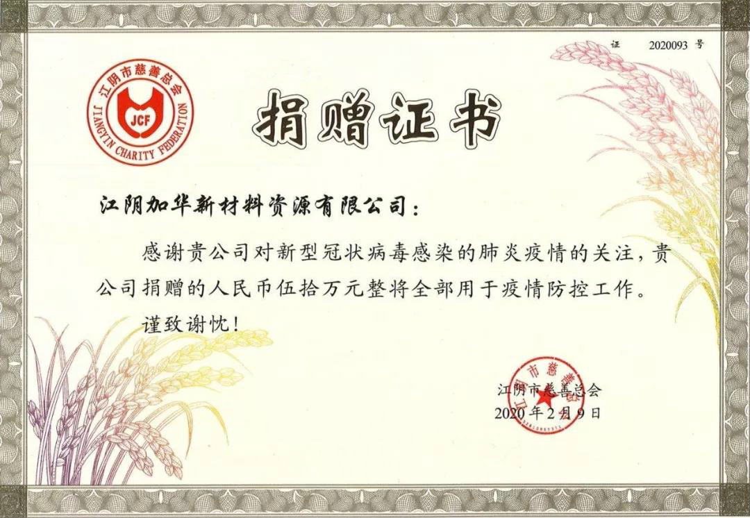 江阴加华新材料资源有限公司捐款50万元用于疫情防控工作。