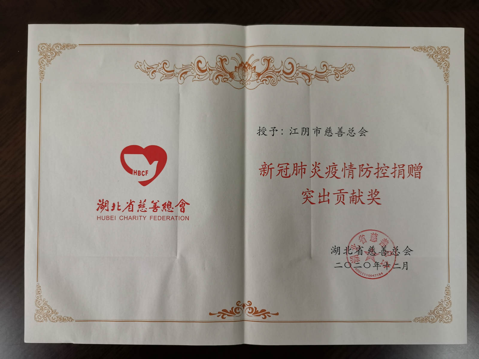 2020年,新冠肺炎疫情突袭而至,给人民群众的生命健康造成巨大影响。江阴市慈善总会积极响应上级号召,按照市委、市政府的部署要求,迅速行动,服务一线,积极作为,为新冠肺炎疫情防控工作贡献了力量。近日,江阴市慈善总会被湖北省慈善总会授予“新冠肺炎疫情防控捐赠突出贡献奖”。