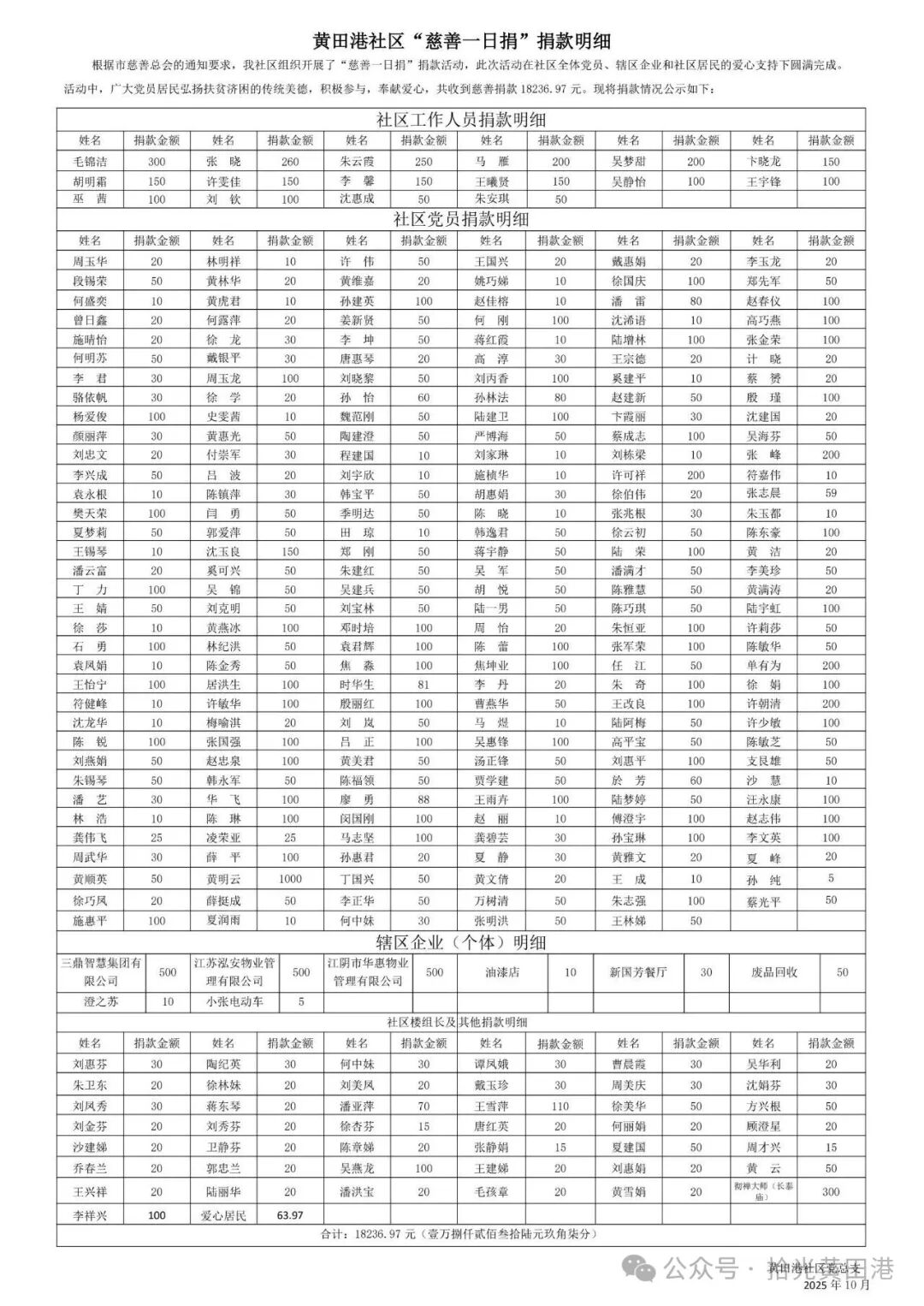 截至目前,“慈善一日捐”活动已圆满结束,黄田港社区共筹集善款18236.97元。现将捐款情况公示如下: