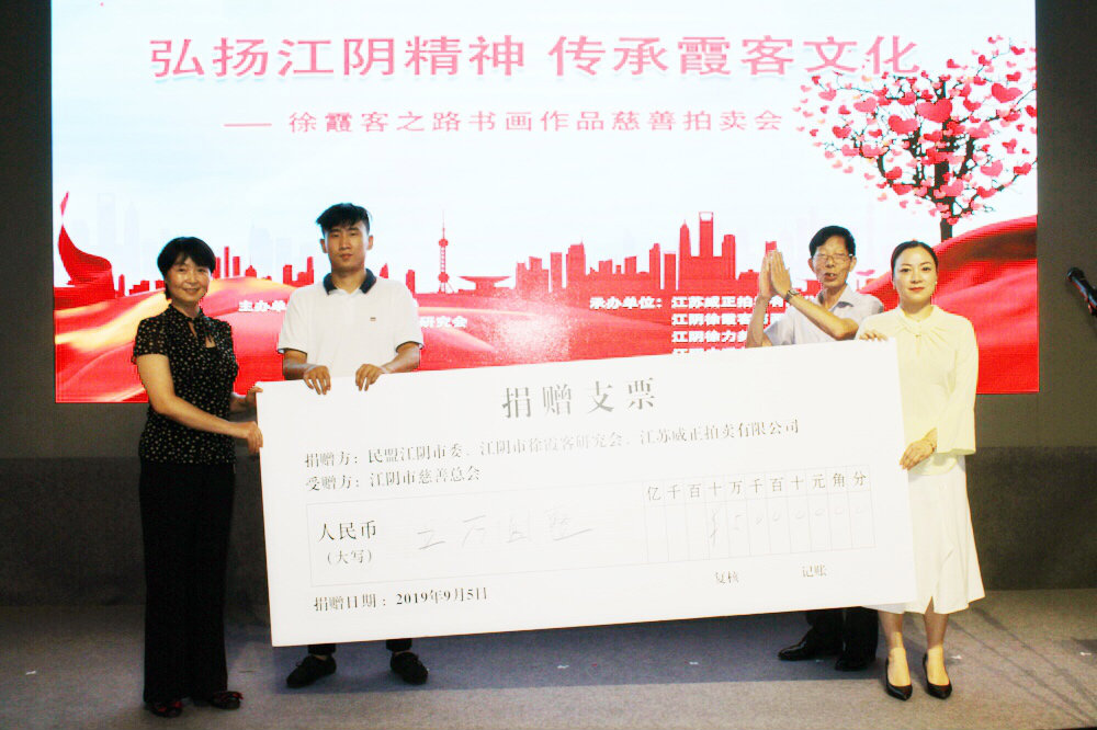 今年9月5日是第四个“中华慈善日”,慈善无界,人人可为,大爱无疆,事事可做。 “弘扬江阴精神 传承霞客文化”徐霞客之路书画作品慈善拍卖会在立澄艺术馆成功举办,拍卖后,江阴市徐霞客研究会名誉会长陈楠与民盟江阴市委秘书长黄宇昕将拍卖所得伍万元善款移交给了江阴市慈善总会,所筹善款将全部用于徐霞客之路沿线贫困地区的教育发展事业。