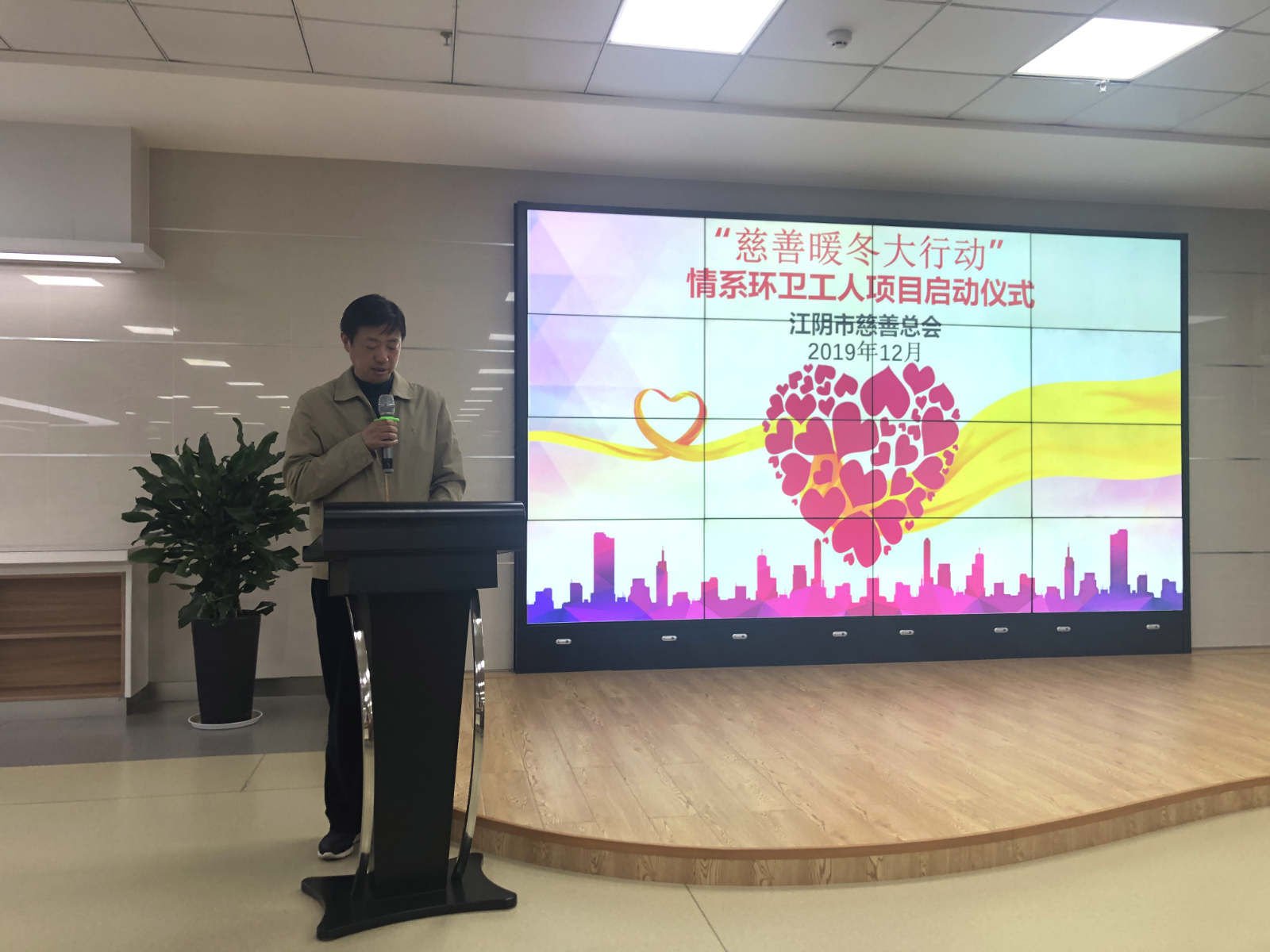 2019年12月17日下午,江阴市慈善总会“慈善暖冬大行动”暨情系环卫工人项目启动仪式在市社会救助中心隆重举行,江阴市民政局副局长许海英,江阴市公用事业管理局党委副书记吴群力,江阴市捐赠救助中心副主任龚海燕,江阴市环卫处副主任武传刚出席本次活动。