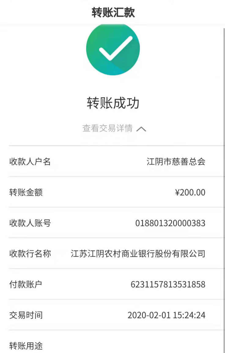 据钱书记介绍,钱老师傅与女儿相依为命,两人都患肢体残疾,腿脚不便,女儿更是常年与轮椅相伴,家庭收入十分微薄,两百元对这个家庭来说已经是一笔不小的支出。最终,钱师傅的两百元现金捐款由村委工作人员代为转账至江阴慈善总会账户。