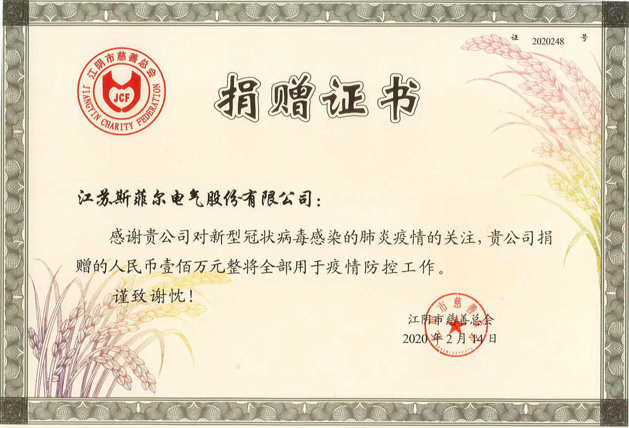 江苏斯菲尔电气股份有限公司捐款100万元用于疫情防控工作。