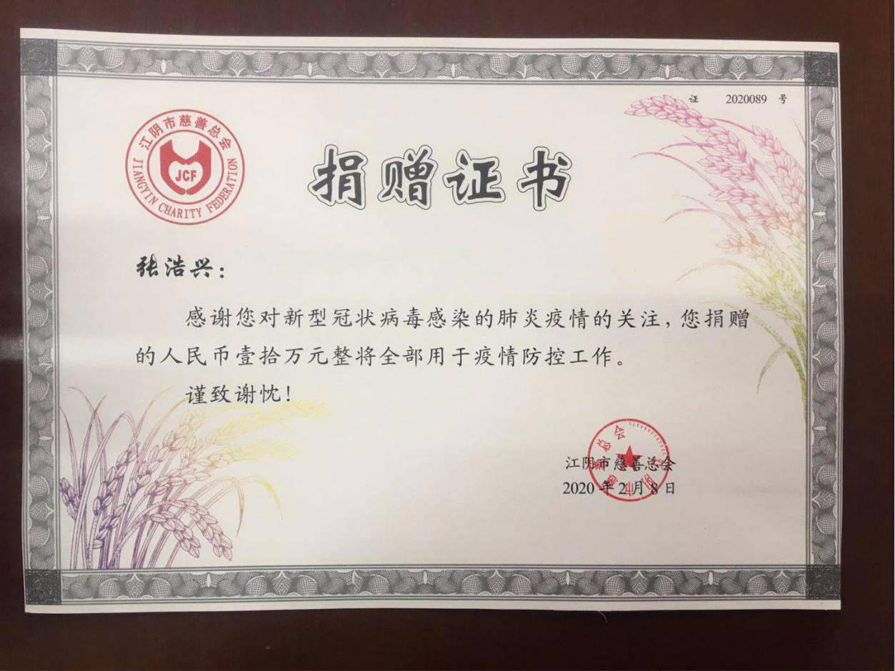 江阴加华新材料资源有限公司捐款50万元用于疫情防控工作。