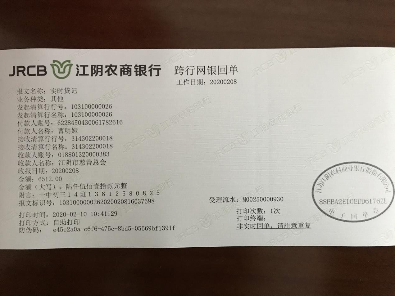 2月8日,市慈善总会收到一笔来自江阴一中初三14班的汇款。这笔爱心款是同学们从自己的零花钱、压岁钱中筹集起来的,希望用于支持新型冠状病毒感染肺炎的防控工作。