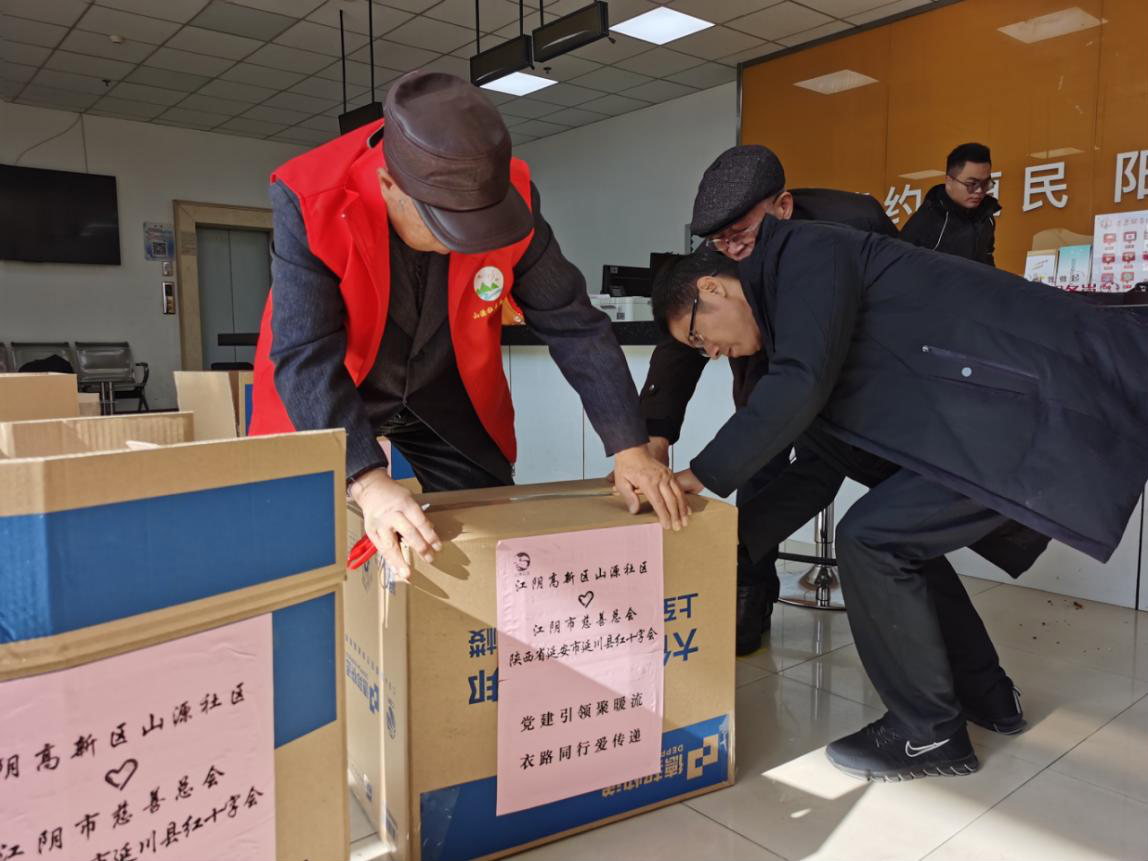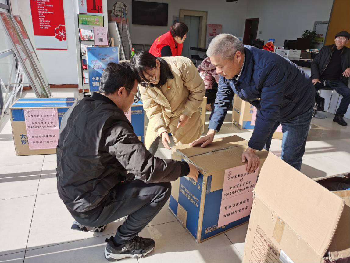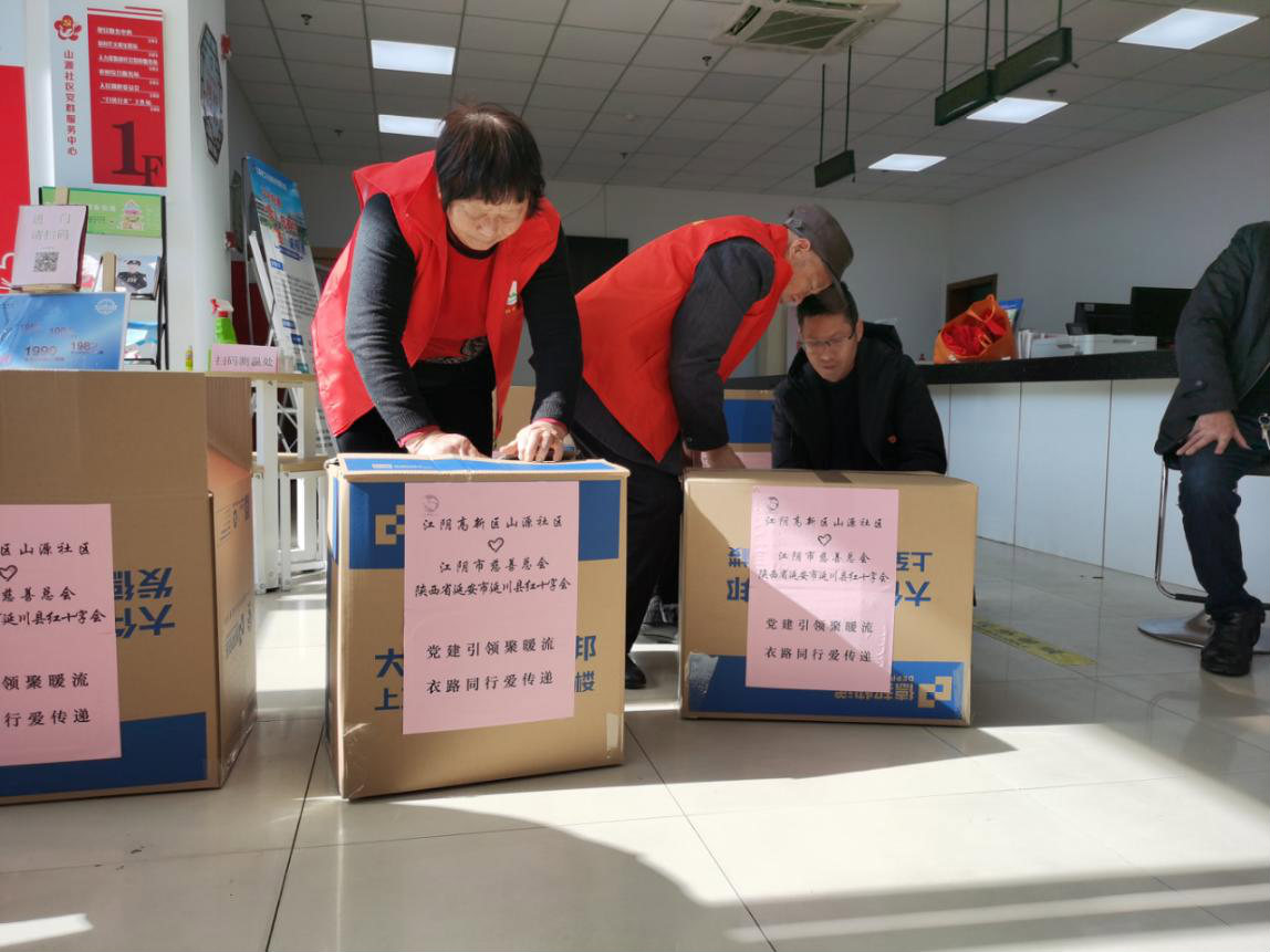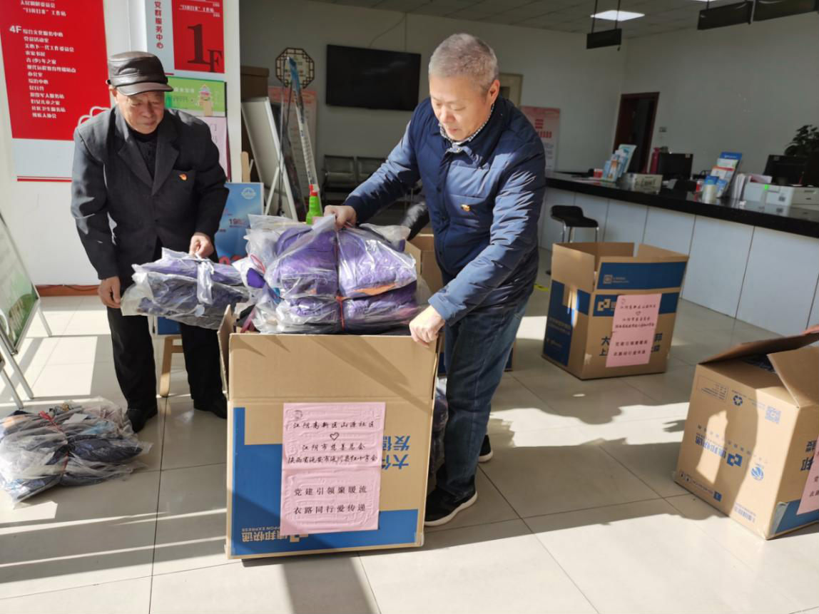 屋外寒风凛冽,滴水成冰,但是山源社区大厅内却是一片热火朝天、暖意融融的景象。党总支部书记胡国才正带领党员们将248件崭新的棉衣打包装箱,这批新衣即将踏上去往陕西省延川县的跨省暖心之旅。