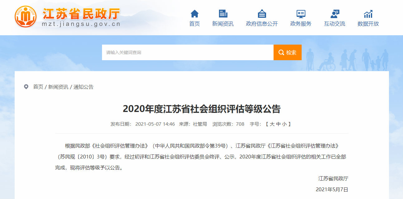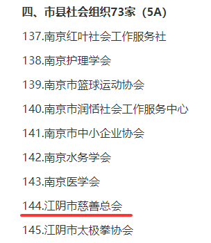 近日,江苏省民政厅发布了《2020年度江苏省社会组织评估等级公告》,江阴市慈善总会荣获5A级社会组织称号。