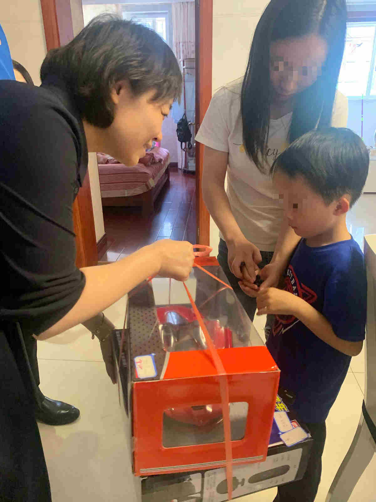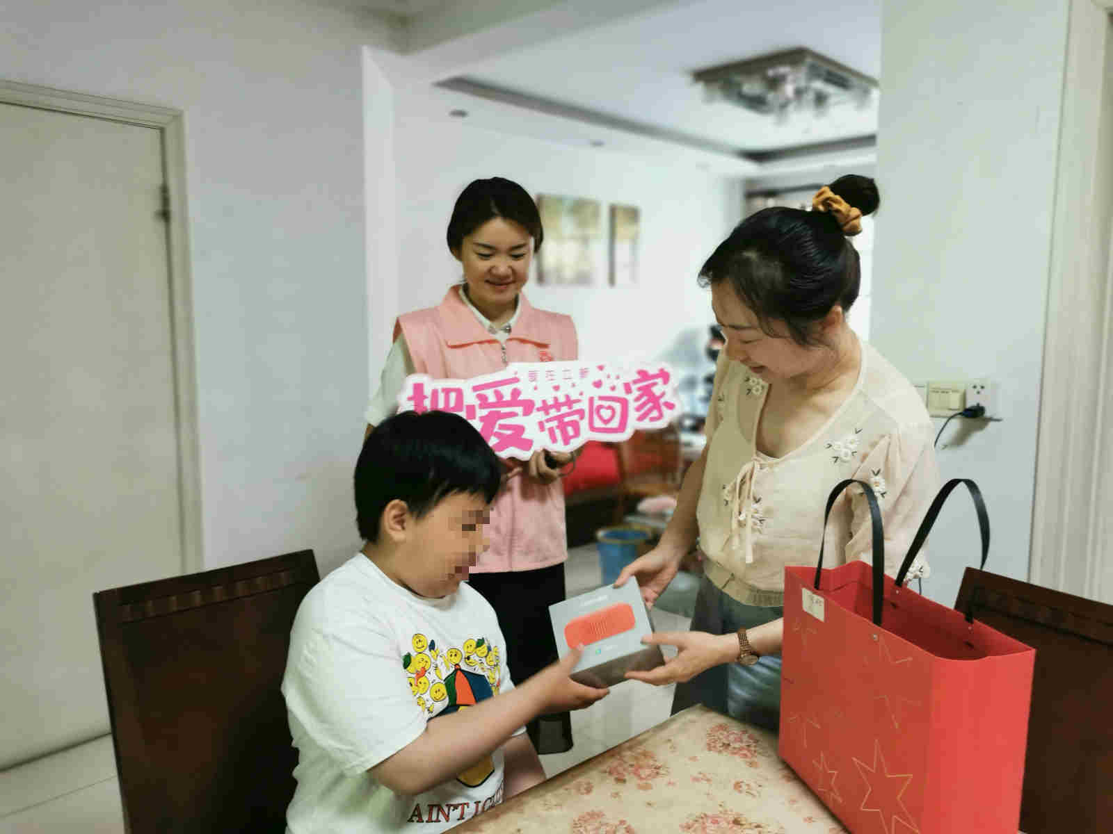△市慈善总会常务副秘书长许海英为清清和哲哲送去礼物