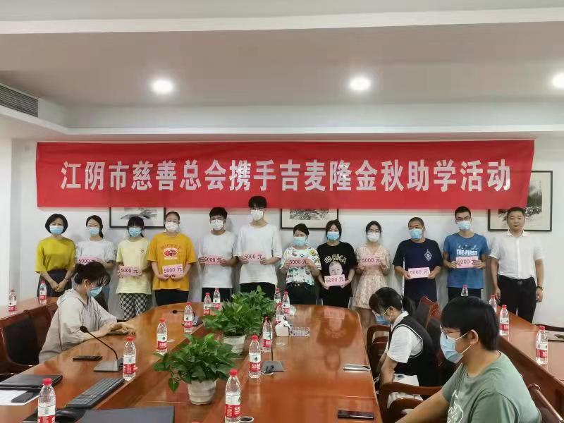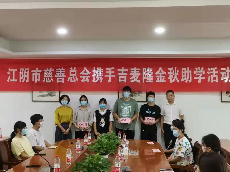 8月24日下午,江阴市市慈善总会携手江阴吉麦隆商贸有限公司开展金秋爱心助学活动,为全市14位品学兼优的贫困大学生发放助学金共计6.2万元。市社会救助管理中心副主任周莹雪、江阴吉麦隆商贸有限公司总经理章雷、相关镇(街道)慈善会活动负责人及贫困大学生代表出席了活动。