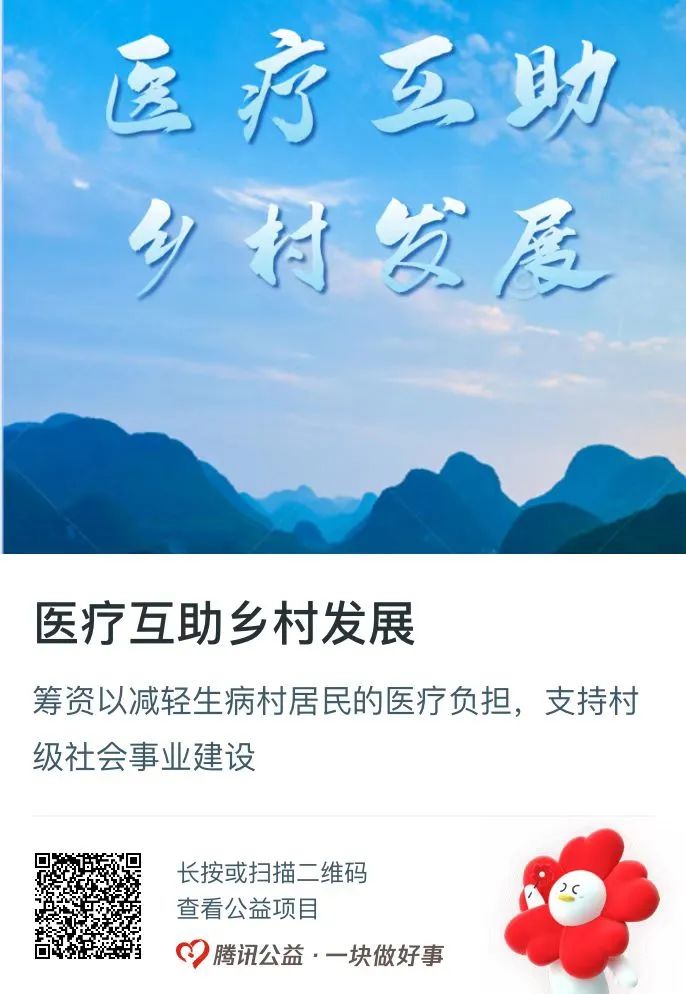 乡村公益医疗互助项目是以乡镇或者规模较大的村为单位来开展乡村公益医疗互助的活动,通过多方筹资来对住院的村居民进行补助。项目过程当中由村民议事会来民主决策,群众以家庭为单位自愿参与。乡村公益医疗互助项目资金筹措坚持“共建共享”原则,筹集的资金全部放在镇(街道)或者村(社区)账上,全部用于按病种补助住院群众,重点补助大病。该项目网络募捐筹款目标为368万元。
