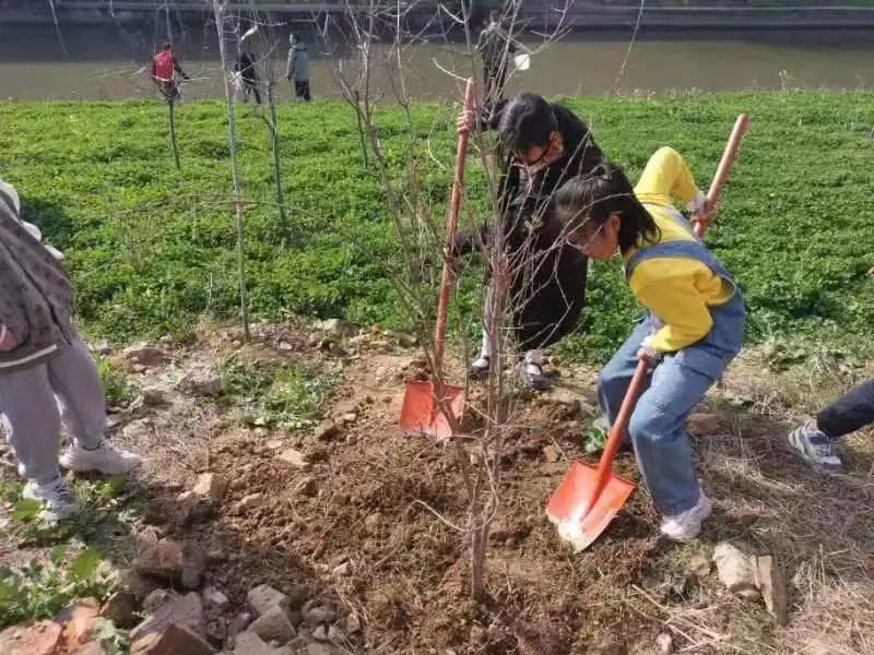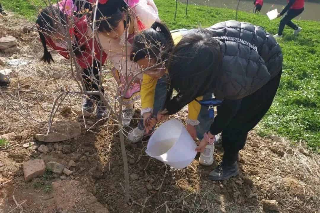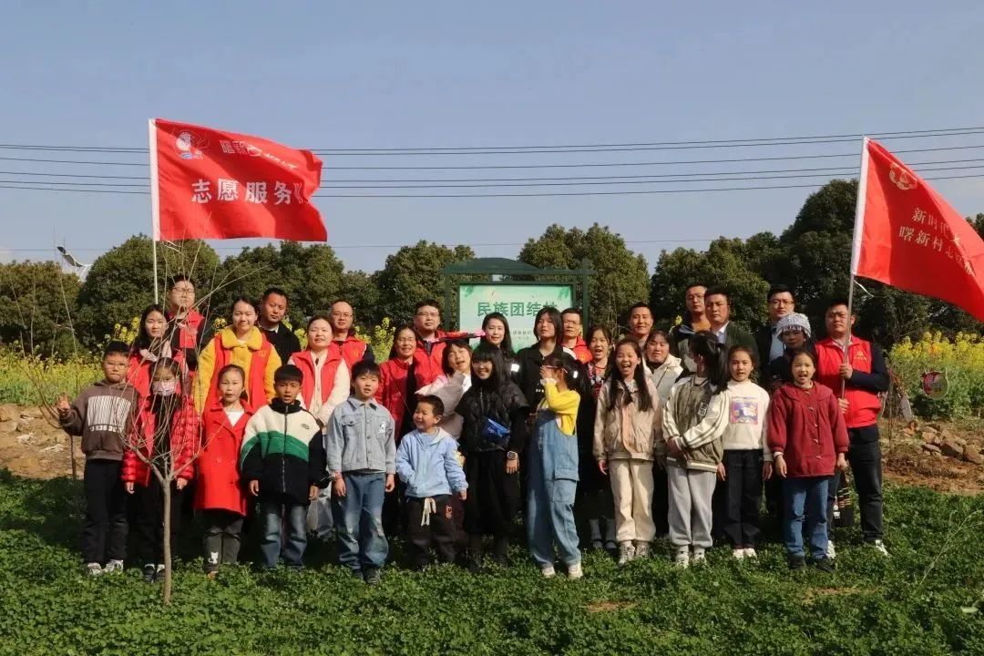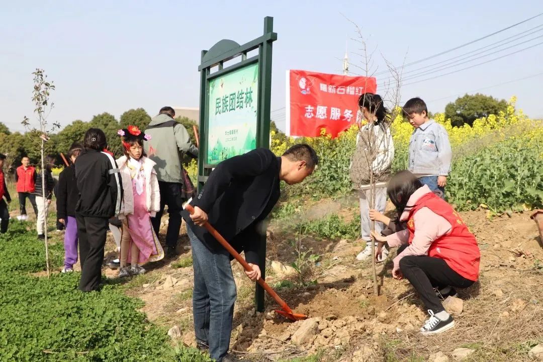 启动仪式结束后,各民族儿童在指导老师的带领下来到曙新村民族团结林,和村、社区党员志愿者一起,开展“认领一棵树,播下一片绿”植树节活动。在活动中,孩子们不仅了解了民族团结林的来源,懂得了青山绿水才是金山银山的道理,更是进一步了解了华士镇各村、社区近几年乡村振兴发展的情况,提升了对第二故乡华士的亲切感、自豪感。孩子们将写上自己名字的认领卡开心地悬挂在树枝上并一起合影,将这幸福的时光定格在这美好的春天里。