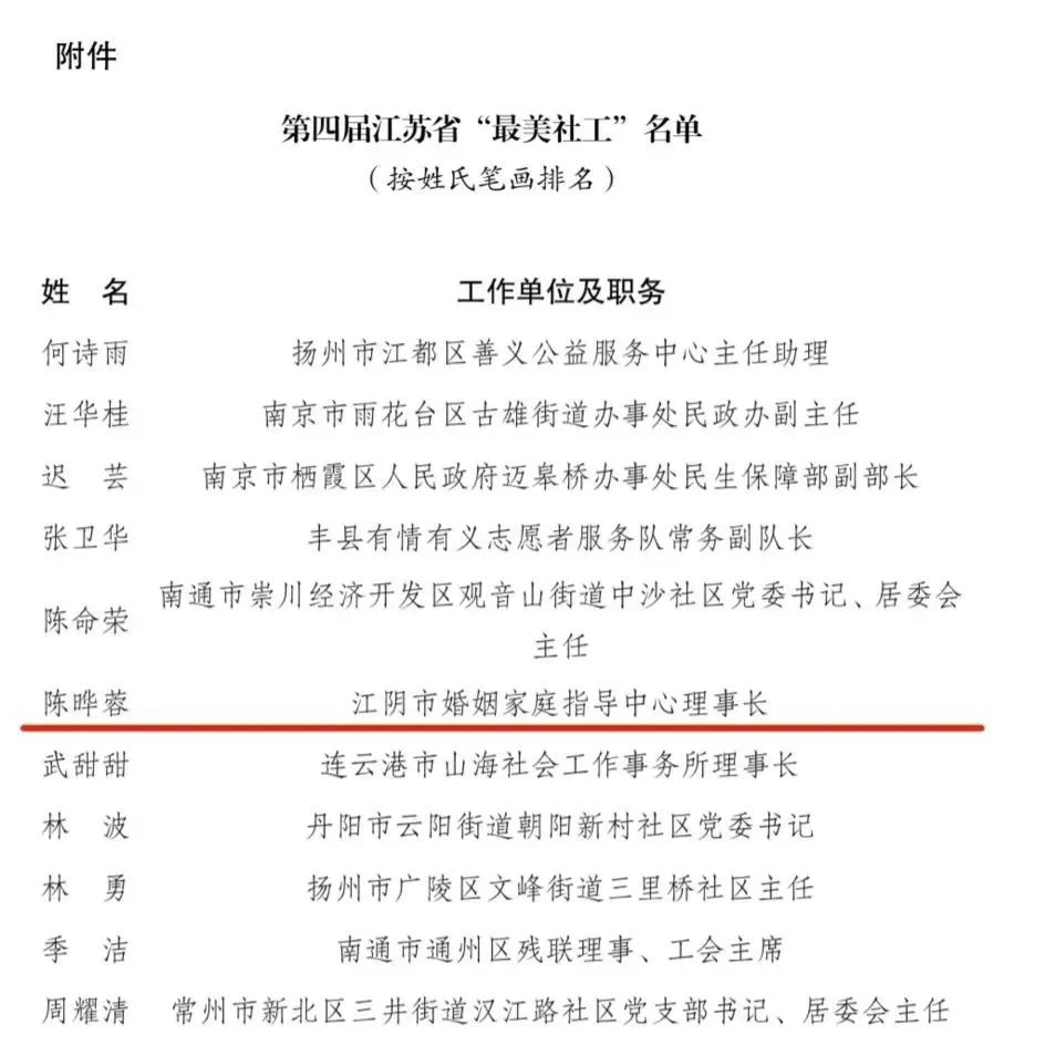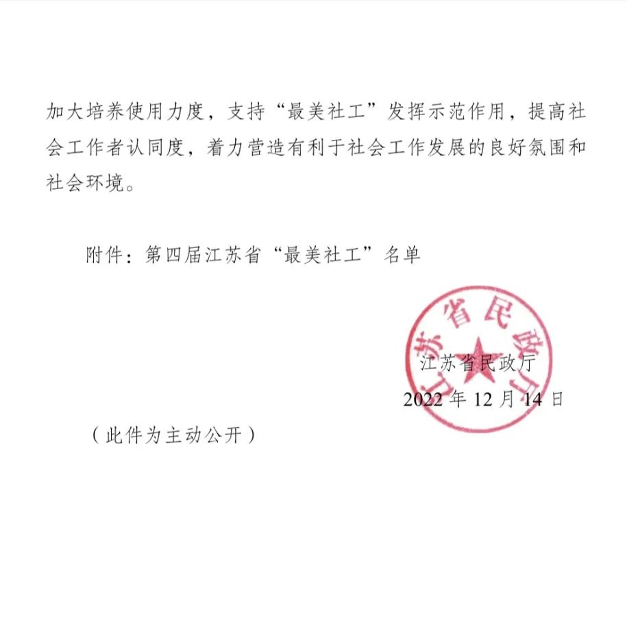 近日,省民政厅公布了2022年度江苏省“最美社工”名单,我市陈晔蓉社工荣获该项荣誉。
