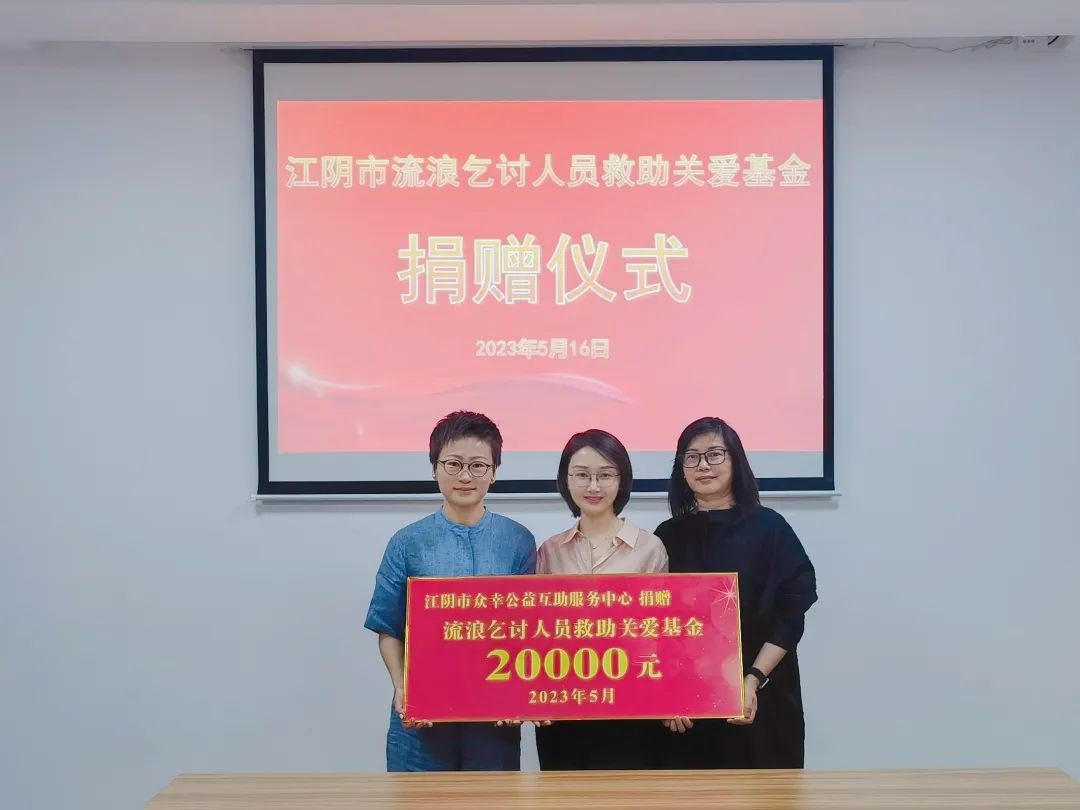 扶危济困是中华民族的传统美德。江阴市众幸公益互助服务中心作为基金捐赠方,一直以扶危济困为宗旨,积极开展乡村医疗互助、助困助老助学等公益服务活动,取得了良好的社会效应。此次捐赠是为更好地帮扶流浪乞讨人员,解决他们实际困难,帮助他们回归家庭,融入社会。