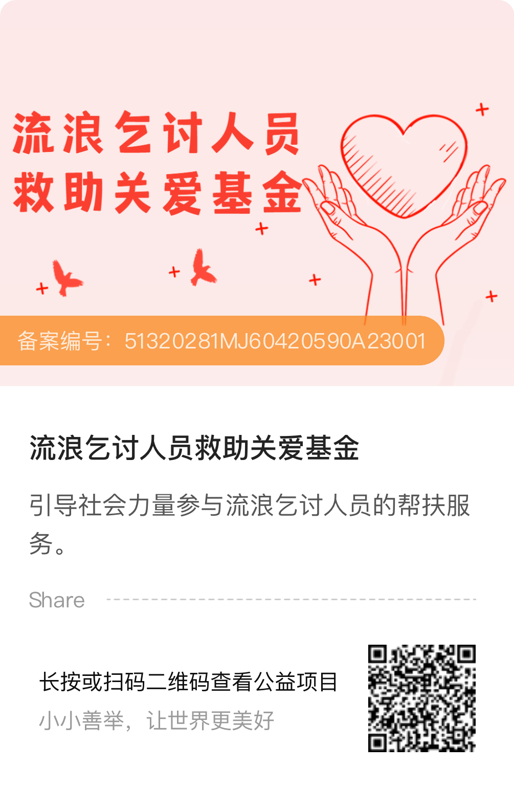 “流浪乞讨人员救助关爱基金”是由江阴市民政局、江阴市社会救助管理中心、江阴市慈善总会联合发起设立的公益慈善基金,旨在引导和支持社会力量参与救助服务,通过开展应急救援、心理疏导、预防帮扶等服务,更好地维护流浪乞讨人员基本权益,进一步提高救助管理服务成效。基金的服务对象主要是居无定所、生活无着、身处困境,回归家庭融入社会存在不同困难的流浪乞讨人员,特别是其中的未成年人。